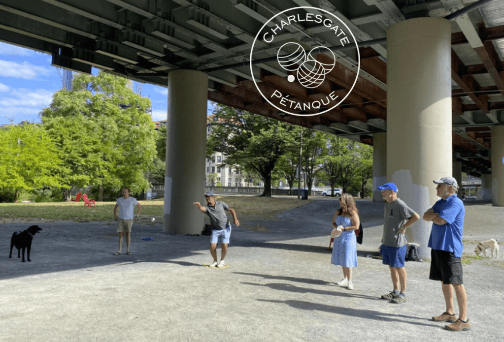 Charlesgate Pétanque is an informal group of pétanque players in the Boston area. We play our games at the Charlesgate Boulodrome (basically a semi-flat patch of fine packed gravel under a bridge) in scenic Charlesgate Park, which is part of Boston’s Emerald Necklace Park System (designed by famed landscape architect Frederick Law Olmsted). Anyone is welcome to join us – we always have extra boules available for newcomers who do not own a set. We announce our game days/times on the Boston Petanque Facebook site, and our Instagram profile is @charlesgate_petanque. You can visit our Scheduling Blog to check for a game or enter your preferred playing times for the current week.