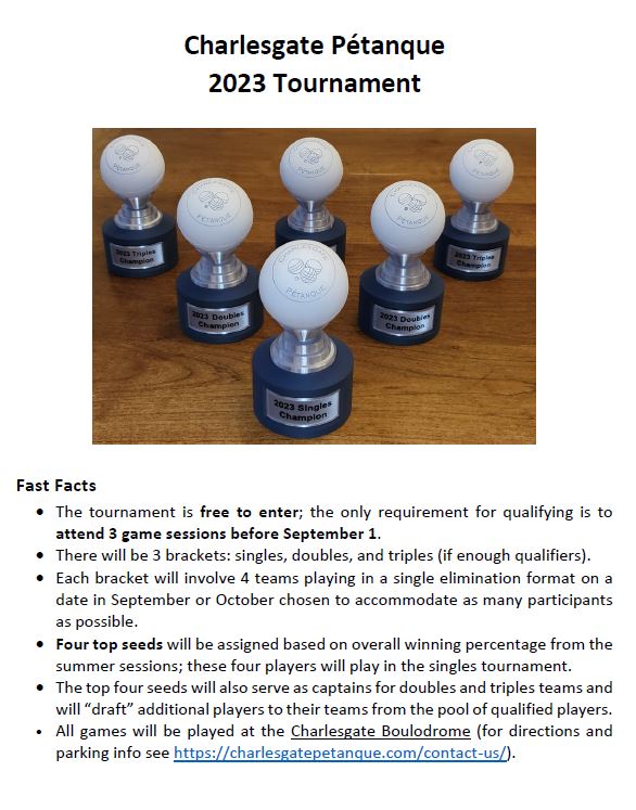 We’ll be playing this Saturday at 2pm at the Charlesgate Boulodrome. As always, all are welcome and we have extra boules for those who need them. Also, see below for information about our upcoming tournament!